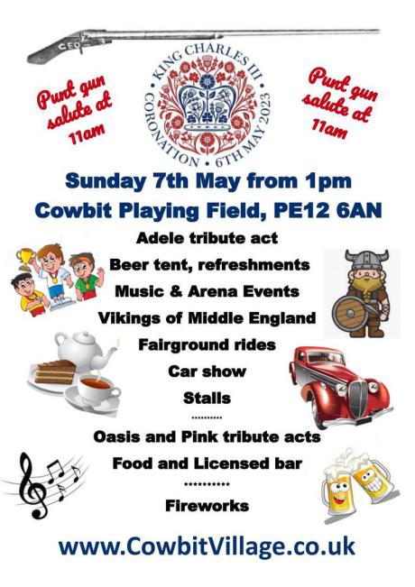 Preparations have now started for this year's Cowbit Fun on the Field and we would like to invite you on Sunday 7th May 2023 for our coronation celebrations, from 1pm on the Cowbit playing field.